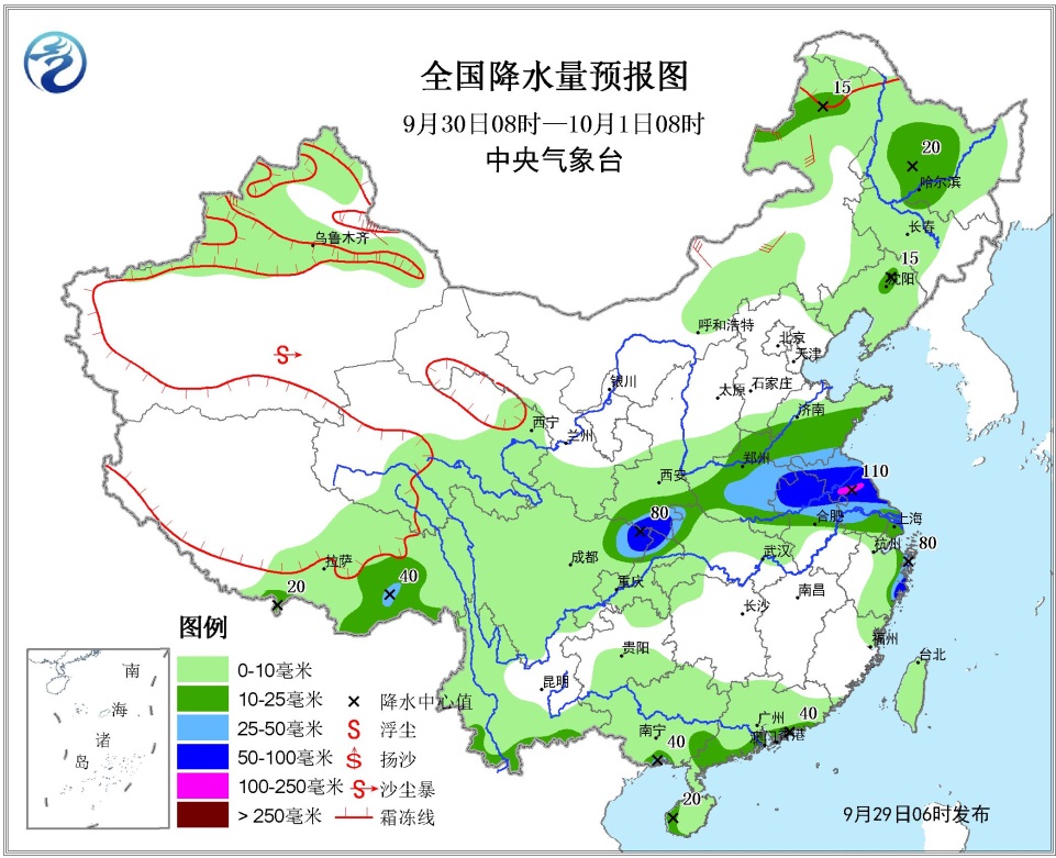 9月30日08時至10月1日08時,四川盆地東北部、黃淮中南部、江淮東部等地有較強降水。四川盆地東北部、陜西東南部、湖北西北部、河南、山東南部、安徽中北部、江蘇、浙江北部和東部沿海以及云南南部、兩廣南部沿海、海南島西部等地有中雨或大雨,其中四川東北部、重慶北部、陜西南部、安徽北部、江蘇中北部等地的部分地區(qū)有暴雨,局地大暴雨。