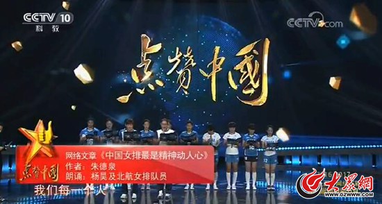 大眾網(wǎng)評論作品《中國女排,最是精神動人心》(作者:朱德泉)入選“百篇網(wǎng)絡(luò)正能量文字作品”。值得一提的是,在央視9月23日晚播出的《點(diǎn)贊中國——2016-2017“五個一百”網(wǎng)絡(luò)正能量精品展播特別節(jié)目》中,中國女排原主力隊員楊昊帶領(lǐng)北京航空航天大學(xué)女排的姑娘們登上舞臺,現(xiàn)場朗誦了這件評論作品的精彩選段,重溫了令人振奮的老女排精神。