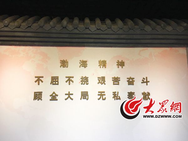 參觀即將結束時,一面鑲著”渤海精神“的白墻吸引了不少編輯記者的眼球。大眾網記者 張瑪睿 攝