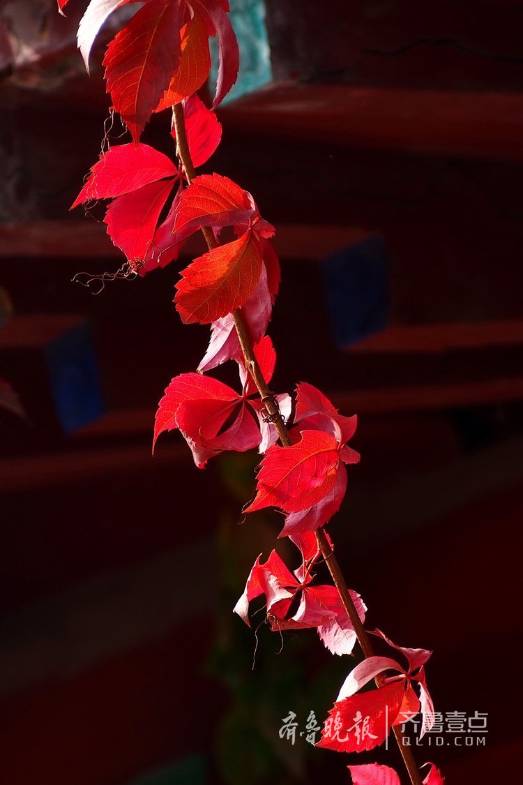 27日,千佛山景區,院墻上的爬山虎在陽光下紅得像火一樣。霜降過后,濟南植物迅速染色。(齊魯晚報·齊魯壹點 記者周青先攝)
