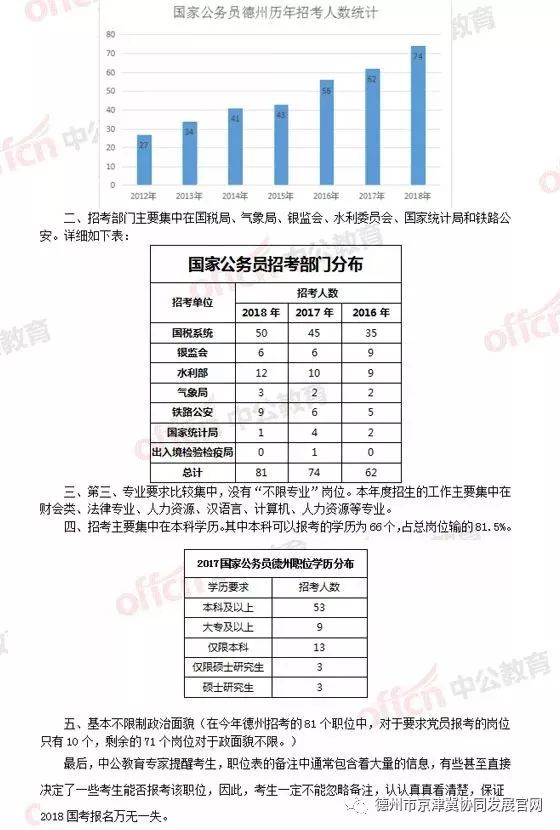 此次涉及德州的崗位共招錄80人。其中,國稅系統共招錄50人,依舊占據“大頭”;北京鐵路公安局德州轄區內招錄3人,濟南鐵路局德州轄區內招錄6人;山東黃河河務局德州黃河河務局招錄2人;漳衛南運河管理局招錄9人;國家統計局山東調查總隊齊河調查隊招錄1人;樂陵市氣象局、臨邑縣氣象局和寧津縣氣象局分別招錄1人;德州銀監分局招錄6人。