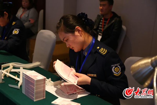 齊魯交通發展集團選手孫玉瑩以3分鐘點鈔16萬元奪冠,平均每分鐘點5萬多元。