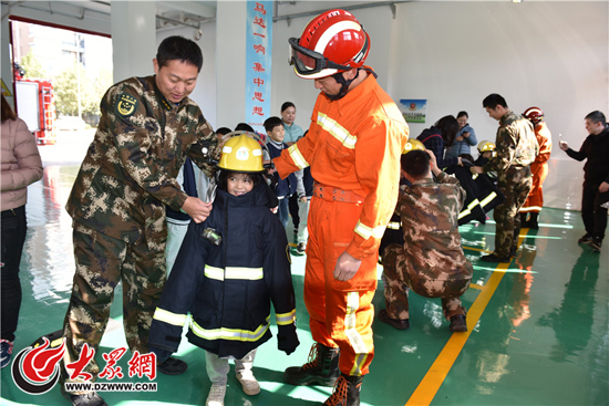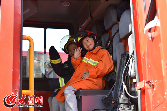山東師大附小大學城校區學生身穿消防服體驗生活。