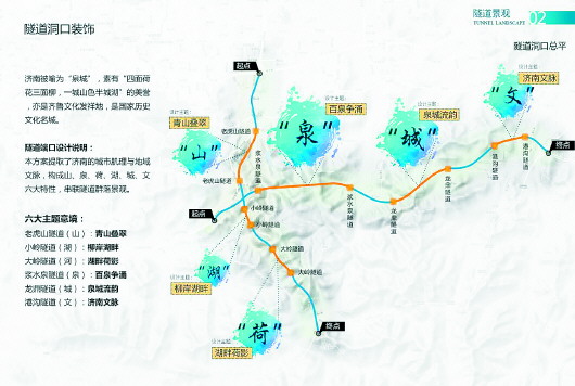 記者了解到,兩個項目中的隧道口設(shè)計提取了濟南的城市肌理與地域文脈,分別以山、湖、荷、泉、城、文為主題,串聯(lián)了隧道群落景觀。其中,老虎山隧道“青山疊翠”、大嶺隧道“湖畔荷影”、小嶺隧道“柳岸湖畔”、漿水泉隧道“百泉爭涌”、龍鼎隧道“泉城流韻”、港溝隧道“濟南文脈”。