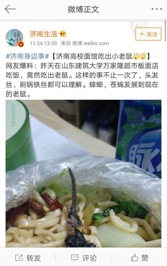 微博爆料稱“濟南高校面館吃出小老鼠”