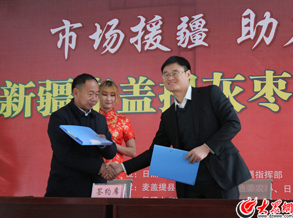 上市儀式上,日照大宗商品交易中心與新疆日照港物流園區(qū)有限公司、新疆棗都現(xiàn)代農(nóng)業(yè)股份有限公司、麥蓋提縣宏偉果蔬棗業(yè)有限公司、麥蓋提升興棗業(yè)果品種植農(nóng)民合作社、喀什神戀有機(jī)食品有限責(zé)任公司、麥蓋提縣潤豐種植業(yè)農(nóng)民專業(yè)合作社、新疆香妃湖花卉莊園有限責(zé)任公司等紅棗加工企業(yè)簽訂合作協(xié)議。