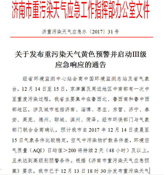 據(jù)濟南市環(huán)保局通報, 經(jīng)省環(huán)境監(jiān)測中心站會商中國環(huán)境監(jiān)測總站及省氣象臺,12月14日至15日,京津冀及周邊地區(qū)中南部有一次中至重度污染過程,我省主要集中在魯西北、魯西南和魯中西部地區(qū),涉及城市包括濟南、淄博、棗莊、東營、濟寧、泰安、萊蕪、德州、聊城、濱州、菏澤。經(jīng)濟南市環(huán)保部門與氣象部門聯(lián)合會商確認,預計濟南市自2017年12月14日凌晨至15日氣象條件比較穩(wěn)定,空氣中污染物擴散條件差,環(huán)境空氣質(zhì)量(AQI)日均值>200將持續(xù)2天(48小時)及以上,且未達到高級別預警條件。根據(jù)《濟南市重污染天氣應急預案》要求,已于12月13日18時30分發(fā)布重污染天氣黃色預警,并于12月14日0時啟動重污染天氣Ⅲ級響應。預警期間采取的應急響應措施包括: