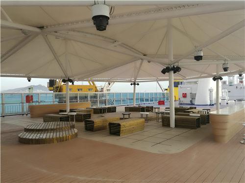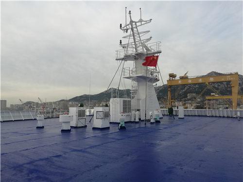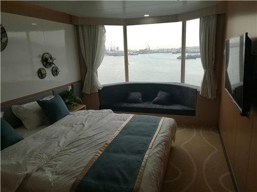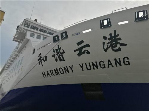 “和諧云港”號是黃海造船有限公司為江蘇連云港一家航運企業建造的,該船總長196米、型寬28.6米、總噸位為3.4萬噸,乘客定額為1080人,車道長度2480米,航速23節。該船按照四星級酒店標準裝修,是目前亞洲最大、最豪華的一艘新型客滾船,該船不僅可承擔旅客和車輛運輸業務,還設有超市、免稅店、酒吧、棋牌室、KTV房、包廂影院等娛樂休閑場所。