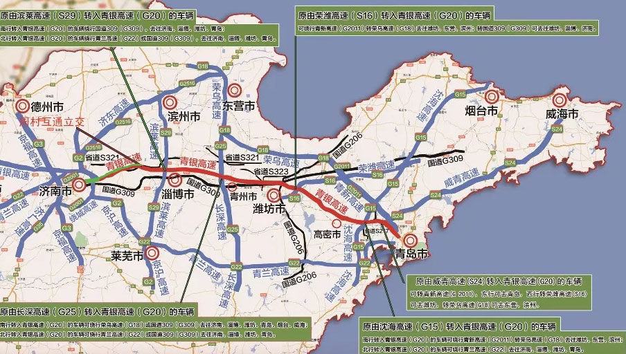 原由長深高速(G25)轉(zhuǎn)入青銀高速(G20)的車輛南行轉(zhuǎn)入青銀高速(G20)的車輛可繞行榮烏高速(G18)或國道309(G309)去往濟南、淄博、濰坊、青島、煙臺、威海;北行轉(zhuǎn)入青銀高速(G20)的車輛可繞行青蘭高速(G22)或國道309(G309)去往濟南、淄博、濰坊、青島。