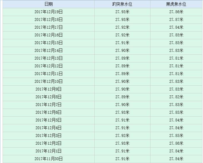 記者對(duì)照趵突泉去年同期水位數(shù)據(jù)發(fā)現(xiàn),去年11月18日到12月19日期間,趵突泉的水位始終維持在28米以上,最低水位為28.72米,最高水位為28.93米,比今年的水位大約高了一米。