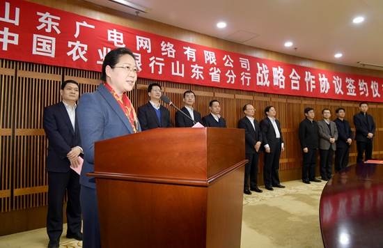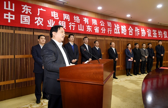 “長期以來,我們兩家保持著良好的合作。此次簽署戰略合作協議,正是順應發展需求,雙方強強聯合,實現優勢互補。”山東廣電網絡有限公司黨委書記、董事長李建華在致辭中表示,山東廣電網絡有限公司是按照現代企業制度建立的省屬國有大型骨干文化企業,是全省宣傳思想文化領域的重要陣地。近年來,中國農業銀行山東省分行為山東廣電網絡有限公司的發展提供了優質高效的金融服務。農業銀行各分行、支行與廣電網絡各分(子)公司都有緊密的業務往來,積極參與了有線電視代繳費工作。