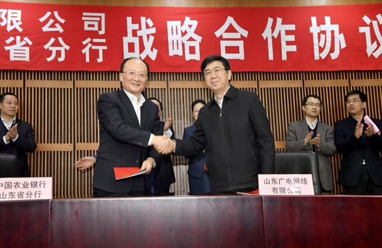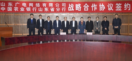山東廣電網絡集團總經理郝克遠和省農行副行長翟世勇作為雙方代表共同簽署協議