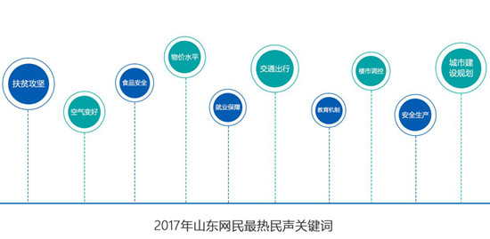 根據網民關注度,分析報告總結出了2017年最受山東網民關注的十大民聲熱詞,分別是:扶貧攻堅、空氣變好、食品安全、物價水平、就業保障、交通出行、教育機制、樓市調控、安全生產、城市建設規劃。