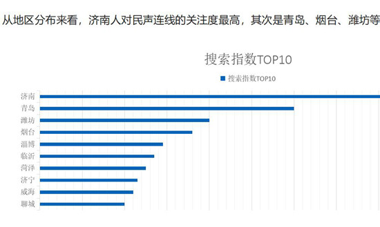 從地區分布來看,濟南人對民聲連線的關注度最高,其次是青島、煙臺、濰坊等。