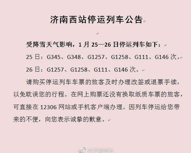 大眾網濟南1月25日訊 記者從濟南西站官方微博獲悉,受降雪天氣影響,1月25—26日途徑濟南10趟高鐵停運,請旅客注意改簽或退票。(大眾網—山東24小時記者 王宗陽)