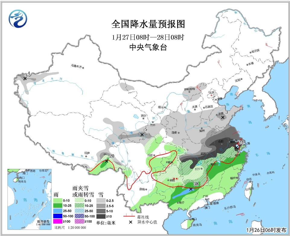 據中央氣象臺預報,27日08時至28日08時,鄂蘇皖浙等地有暴雪,貴州部分地區有凍雨。湖北南部和東部、安徽大部、江蘇大部、江南北部和西部、河南東南部及南疆西部山區、青海東南部、西藏東南部、山東中部等地有中到大雪或雨夾雪。內蒙中部、遼東半島、山東半島、江淮東部等地有4~6級風。臺灣海峽、南海東北部有8級、陣風9級的大風。
