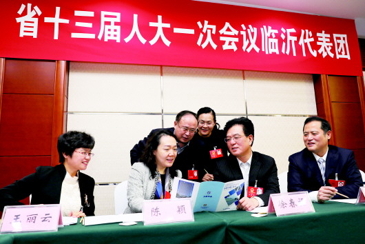 1月27日,出席省十三屆人大一次會議的臨沂團徐春福代表(右二)向陳穎、張善久、徐光琴、徐仲圣(從左至右)等代表介紹光伏路面節(jié)能情況,就打好精準脫貧攻堅戰(zhàn),助力沂蒙老區(qū)高質(zhì)量發(fā)展展開熱烈討論。記者 王世翔 報道