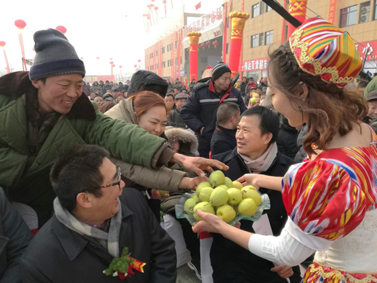 活動(dòng)現(xiàn)場(chǎng),臨沂市民爭(zhēng)相品嘗正宗新疆庫(kù)爾勒香梨
