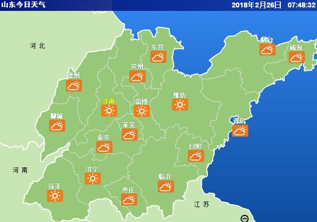 2月28日,魯西北的東部、魯中的東部、魯東南和半島地區天氣陰有小雨,其他地區天氣陰轉晴。魯南和半島地區南風短時北風4~5級,魯西北地區北風短時南風4~5級,魯中地區南風轉北風3~4級。