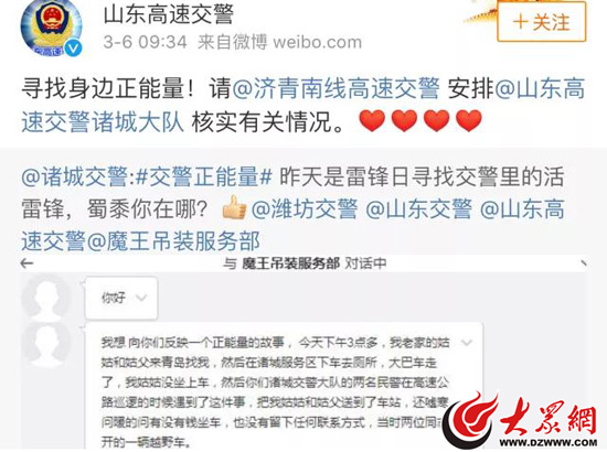 大眾網濟南3月6日訊 今天早晨,一則“人肉”濟青南線高速交警的消息在微博上傳開來。網友“魔王吊裝服務部”的親戚昨天被大巴車落在諸城服務區,所幸老兩口獲得高速交警的幫助,順利到達了車站。經查找核實,為老人提供幫助的是高速交警二支隊諸城大隊的民警。