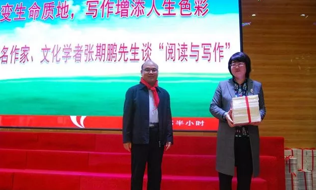 講座現場,張期鵬將自己的作品《淡淡的背影》300多本現場贈送給花園學校,這是一部以齊魯歷史文化為主題的散文隨筆集,也是一本讀史札記。