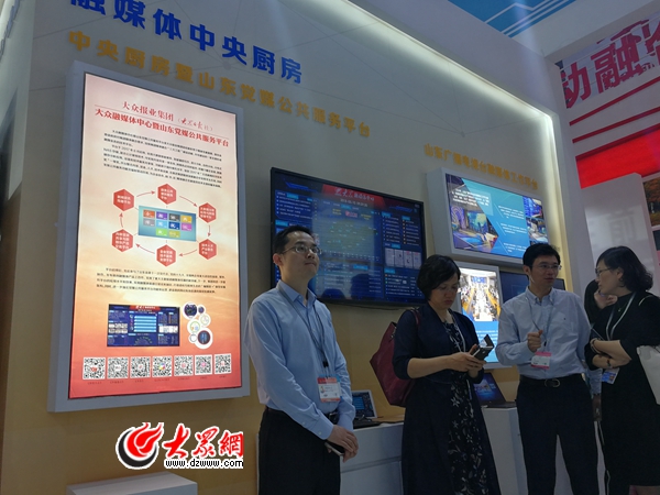 在山東館入口顯著位置,文化產(chǎn)業(yè)新業(yè)態(tài)版塊重點(diǎn)展示了以大眾報(bào)業(yè)集團(tuán)(大眾日報(bào)社)中央廚房暨山東黨媒公共服務(wù)平臺為代表的媒體融合最新成果。