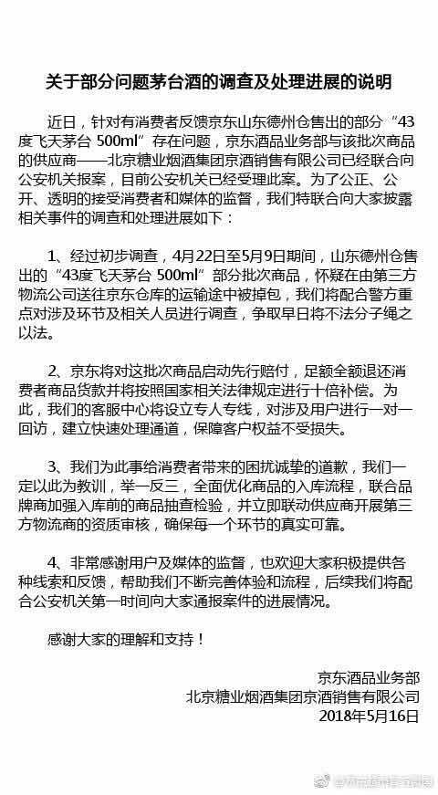 16日,京東酒品業(yè)務(wù)部與北京糖業(yè)煙酒集團(tuán)京酒銷(xiāo)售有限公司聯(lián)合發(fā)布“關(guān)于部分問(wèn)題茅臺(tái)酒的調(diào)查及處理進(jìn)展的說(shuō)明”。說(shuō)明指出,經(jīng)過(guò)初步調(diào)查,4月22日至5月9日期間,山東德州倉(cāng)售出的“43度飛天茅臺(tái)500ml”部分批次商品,懷疑在由第三方物流公司送往京東倉(cāng)庫(kù)的運(yùn)輸途中被掉包,我們將配合警方重點(diǎn)對(duì)涉及環(huán)節(jié)及相關(guān)人員進(jìn)行調(diào)查,爭(zhēng)取早日將不法分子繩之以法。