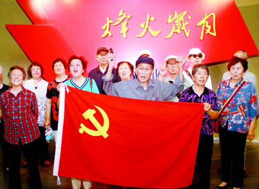 殷樹山夫婦(前排中為殷樹山,左一為劉彩鳳)組織社區(qū)黨員進(jìn)行革命傳統(tǒng)教育。