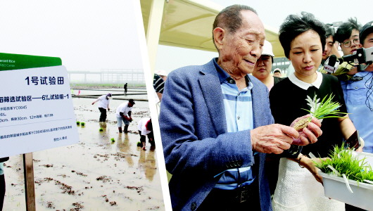 □記者 張曉帆 報道 左圖:工作人員在青島市城陽區濱海鹽堿地稻作改良示范基地插秧。右圖:插秧現場,袁隆平親手篩選“海水稻”秧苗。