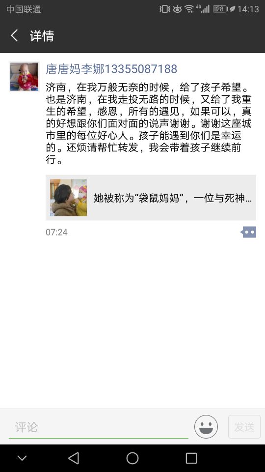 大眾網(wǎng)記者看到,李娜今早又在朋友圈發(fā)了一條信息,感恩好心人:“濟南,在我萬般無奈的時候,給了孩子希望。也是濟南,在我走投無路的時候,又給了我重生的希望,感恩,所有的遇見,如果可以,真的好想跟你們面對面的說聲謝謝。謝謝這座城市里的每位好心人。孩子能遇到你們是幸運的。我會帶著孩子繼續(xù)前行。”