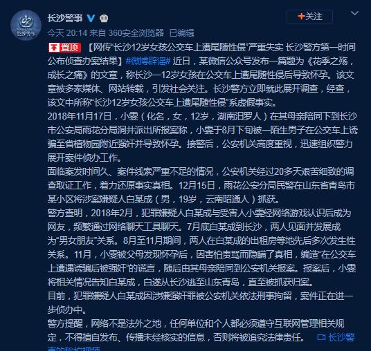 17日,長沙警方發布通報稱,近日,某微信公眾號發布一篇題為《花季之殤,成長之痛》的文章,稱長沙一12歲女孩在公交車上遭尾隨性侵后導致懷孕。該文章被多家媒體、網站轉載,引發社會關注。長沙警方立即就此展開調查,經查,該文中所稱“長沙12歲女孩公交車上遭尾隨性侵”系虛假事實。