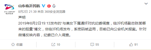 當晚21:39分,山東臨沂民航在其官方微博發(fā)布聲明,就上述轉(zhuǎn)發(fā)博文作出回應(yīng):2019年8月2日19:13發(fā)布的“與美女下屬通奸對抗紀委調(diào)查,臨沂機場副總陳某哪來的膽量”博文,非臨沂機場發(fā)布,系密碼被盜用,目前已向公安機關(guān)報案。針對微博反映內(nèi)容,紀委已介入調(diào)查。