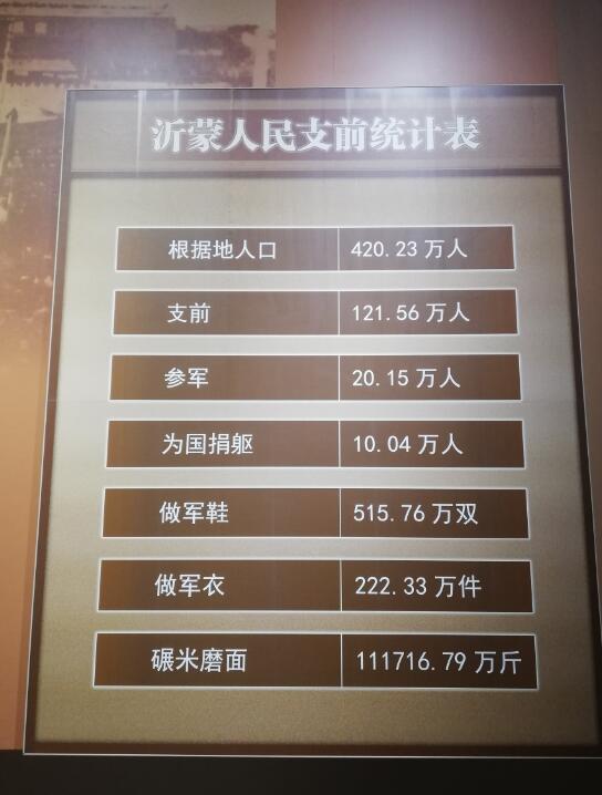 臨沂被譽為“兩戰圣地、紅色沂蒙”,有“華東小延安”之稱;當時沂蒙革命根據地420萬人口,有120多萬人擁軍支前,21.4萬人參軍參戰,10.5萬名烈士英勇犧牲,涌現出紅嫂、沂蒙六姐妹等一大批先模人物,“最后一粒米做軍糧、最后一尺布做軍裝、最后一個兒子送戰場”,是沂蒙人民擁軍支前的真實寫照。在長期的革命和建設實踐中,臨沂軍民用汗水、鮮血和生命培育形成了“水乳交融、生死與共”的沂蒙精神。