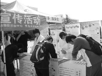 在青島大學搞的預防艾滋病宣傳活動引來不少大學生駐足。
