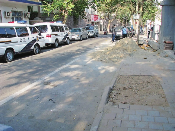 百歲老樹成畸形擋了路在齊東路上,江蘇路派出所門口的一棵樹被伐后,只剩下一個空洞的樹坑。 記者 趙波 攝