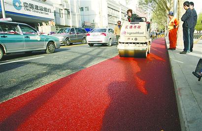 從16日凌晨4點開始,文化西路分段封閉鋪設瀝青。今天下午5點,記者在文化西路看到,快車道已完成瀝青鋪設和路面劃線,僅剩北側非機動車道未鋪。在文化西路南側自行車道上,施工人員正進行彩色瀝青的收尾鋪設,橙紅色自行車道與北側黑色路面對比鮮明,宛若一條橙紅色絲帶嵌在路上,給單調的馬路抹上了一道亮色。現場施工人員稱,這是專為自行車道鋪設的“彩路”,長約2500米、寬2米,從文化西路棋盤街路口一直延伸到青年西路橋。跟黑色瀝青路面相比,彩色路面更有彈性,質地更為細膩。“這種彩色路面更適合自行車和行人,在上面走起路來不會感覺硬邦邦的,相對比較舒服。”現場施工人員表示,橙紅色瀝青一般在地面溫度達到約100℃時進行攤鋪,等瀝青還沒有形成強度時一次性攤鋪完成。橙紅色瀝青冷卻速度更快,一旦冷卻降溫,很難再進行修補。溫度下降之后,在壓路機重壓下,橙紅色瀝青膜會破裂,露出底下的黑色中粒式瀝青,影響美觀。普通路面上的瀝青里外都是黑色,就算破壞上層瀝青膜,露出底下的黑色中粒式瀝青,也基本不影響美觀。