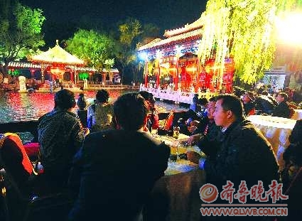 從4月18日起,趵突泉公園夜間“觀泉品茶”文化廣場重新開放,公園開放時間也調整為7:00至21:00。夜場期間票價減半,公園年票、通游年票正常使用,老年證等免費證件不能使用。圖為游客在觀泉品茶。