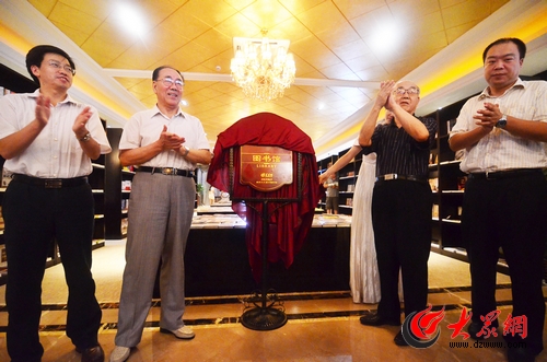 山東老年書畫研究會名譽會長宇培杲(左二),山東新聞書畫院院長、山東新聞美術家協會名譽主席劉廣東(左三),大眾網董事長、總經理林忠禮(左一),濟南保利置業有限公司總經理耿立致辭共同為保利圖書館揭幕。