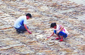 魚販子用腳踩踏"魚干"