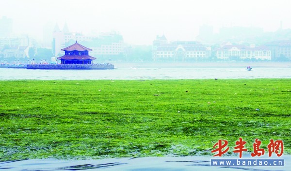 7日上午,記者跟隨山東海警二支隊官兵,從小港海域出發,巡查到浮山灣發現,在團島灣、青島灣、浮山灣,均有成片的滸苔聚集區。其中,青島灣最為嚴重,出現近千平方米的滸苔聚集區。