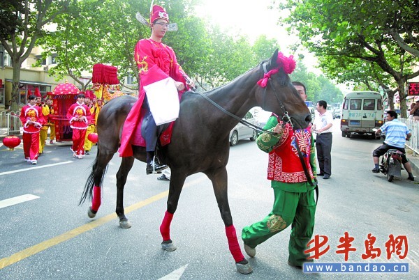 7月16日上午,在臺湛路舉行了一場別開生面的復古婚禮,新郎騎馬當先,新娘坐轎在后,熱熱鬧鬧的婚禮吸引了眾多市民的關注。據了解,馬是從一家馬術俱樂部租來的,為了騎好馬,新郎婚禮前還經過專門培訓。業內人士認為,這種婚禮符合當前低碳環保的生活方式。