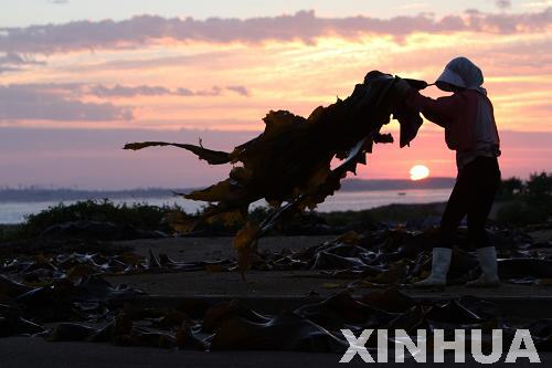 7月21日,在山東榮成沿海的一處海帶晾曬場上,一名女工迎著日出晾曬海帶。(王福東 攝)