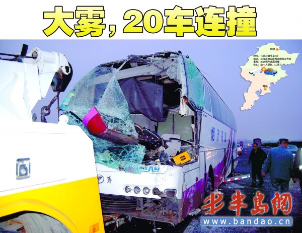 10月31日早晨7點左右,在沈海高速公路煙臺和青島的交界處發生了一起20多輛車連續追尾相撞的事故。直到下午5點多,事故車輛才全部處理完畢。記者下午5點趕到時,現場留守的救援人員和救援車輛已經不多,記者沒有得到官方信息。但是,一直在現場工作的一位清潔工告訴記者,其中一名長途客車司機死亡,數十人在事故中受傷。