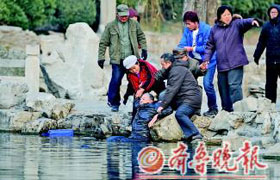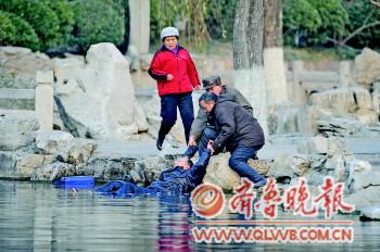 12月27日上午8時許,濟南五龍潭公園內,一老人落水呼救,路人聞聲而來。從一個到兩個,再從兩個到三個……最終,落水老人被眾人救了上來,甚至他的手提袋也被撈了上來。