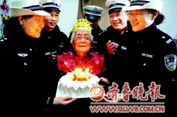 3月6日,濟南天橋交警大隊的民警來到天橋晚晴老年公寓,為百歲老人王朝英過生日,從1992年起,天橋交警大隊民警開始義務照顧老人,至今已20年了,民警們經常幫助老人洗衣、看病,前幾天還帶老人游覽了大明湖。這些年來,交警大隊民警換了一茬又一茬,而照料老人的“愛心接力棒”卻一直延續著。 圖為6日,王朝英老人在她的交警“兒女”的陪伴下喜過百歲壽辰。 本報記者 陳文進 本報通訊員 黃翌 攝影報道