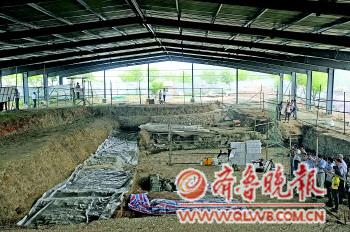 文/本報記者 喬顯佳 片/本報記者 張中 6月8日,國內罕見的山東沂水天上王城景區(qū)崮頂春秋國君級大墓考古現(xiàn)場,再次向媒體記者敞開。其中,主墓室基本見底,清理出30多件精美的隨葬玉器,其中有兩件玉戈長達20厘米。墓主遺骸仍未出土,許多謎團有待進一步破解。 主墓將見底未現(xiàn)遺骸 8日下午3時許,考古人員打開主墓室上覆蓋的篷布、塑料薄膜,神秘的棺底部分展現(xiàn)在記者面前。 首先進入眼簾的是大量的玉器,其體量、形狀不一。其中較大的是兩件玉戈,長約20厘米。玉戈通常作為禮器使用,如此大的玉戈出現(xiàn)在墓主人棺室中,再次證實墓主身份尊貴。另外,還有一組玉覆面,由若干件雕刻精美的玉片組成,2500年前的能工巧匠,精心地將每片玉片雕琢成嘴、鼻子、耳朵的形狀,用于覆蓋在死者的五官上;此外,還有多件玉璜、玉琮、玉環(huán)等,另外還有玉質串飾,每顆體積只有花生米大小。大小玉器在棺底相互疊壓、羅列,蔚為壯觀。 盡管對主墓室的發(fā)掘即將見底,但是人們關心的墓主遺骸依然未出現(xiàn)。就是國內一位權威考古專家細心看完現(xiàn)場之后,也表示尚未發(fā)現(xiàn)一點兒遺骸痕跡。對此,有現(xiàn)場考古人員解釋為,經歷約2500年深埋之后,墓主遺骸可能已經完全腐朽,看不到了。 “當然,也存在一種可能是,墓主的遺骸就掩埋在玉器之下,隨著清理就會出現(xiàn)。”省考古所副所長孫波說。隨著發(fā)掘這一謎底將揭開。 現(xiàn)場發(fā)現(xiàn)“靈棚”遺跡 因為現(xiàn)代人建設施工,崮頂春秋墓的北側位置以及東部,被后人打破,其中北側建水池挖掉約七八十平方米。近期,考古隊繼續(xù)在水池旁邊打探溝,找到了墓室的北壁。使得崮頂春秋墓由原來的殘長28米,寬13.6米,變成長約40米。根據(jù)已發(fā)現(xiàn)的殉馬坑車馬規(guī)格推測,當年至少有10組車馬,每組有兩匹馬、一輛車組成,新“增”的墓長證實考古推測成立。 在殉馬坑東北側,考古人員意外地清理出10處埋柱子用的柱坑,每個柱坑呈現(xiàn)大小環(huán)相扣狀,其中,外環(huán)為當年挖坑埋柱子的,內圓為立柱所留,直徑較大,顯示柱體較粗,盡管為臨時搭建建筑,但葬禮規(guī)格極高。孫波說,10個柱坑的發(fā)現(xiàn),證明當年建墓時曾搭建一座臨時性的建筑,用于住人或者堆放祭祀用器,其功能相當于今天的“靈棚”。 文物留在當?shù)乇Wo研究 孫波介紹,目前墓主性別、國別、族別等問題仍是個謎。要解答上述疑問,最有說服力的證據(jù)就是青銅器上留下的銘文。據(jù)考古隊領隊郝導華介紹,起運青銅器、玉器等文物,將在近二十天內進行。這是一個相當細致的活兒,屆時文保專家將介入。 沂水天上王城景區(qū)一位負責人8日向記者透露,7日,沂水縣政府已經與省文物部門達成初步意向,崮頂春秋墓出土文物將在沂水就地保護、研究。目前,景區(qū)方面正緊急做遺址博物館的規(guī)劃,以及打造5A級景區(qū)的建設規(guī)劃。