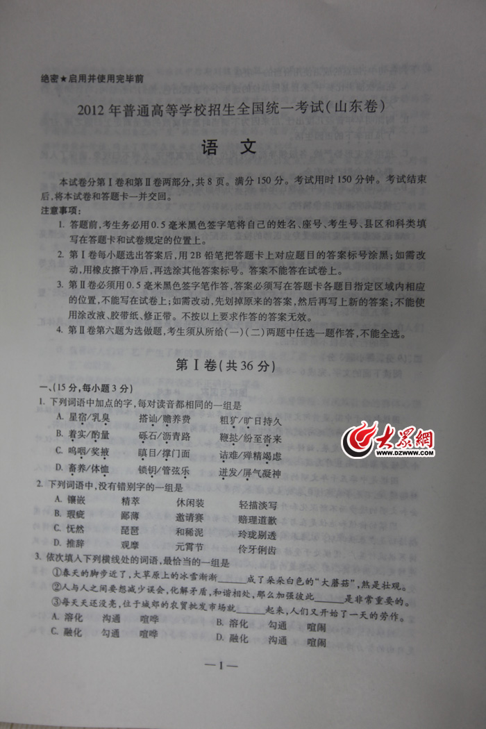 2012年山東高考語文試題及參考答案 2012-06-09 20:07