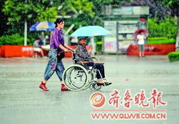 26日上午10時左右,一場疾風驟雨突襲濟南,一位市民一邊冒著雨,一邊推著輪椅上的老人趕路。 本報記者 左慶 攝