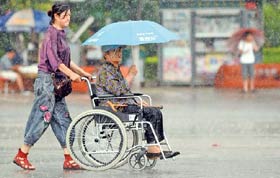 6月29日,市民行走在濟(jì)南街頭。當(dāng)日,山東省出現(xiàn)降雨天氣,局部地區(qū)暴雨,覆蓋全省的此次降雨有效緩解了旱情。2012年以來(lái),山東平均降水量只有102.7毫米,比歷年同期偏少45.7%,3702萬(wàn)畝農(nóng)田出現(xiàn)不同程度的旱情。新華社記者徐速繪攝