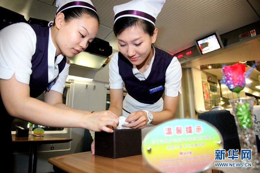 7月1日,兩名第一天參加工作的90后“高姐”在列車內布置餐桌。 7月1日開始,鐵路濟南客運段新招收的124名90后“高姐”經過專業培訓和考試后走上工作崗位,正式為旅客提供服務,這批新生力量的加入將滿足當日鐵路大面積調圖后增加車次、保證服務質量的需要。新華社記者徐速繪攝